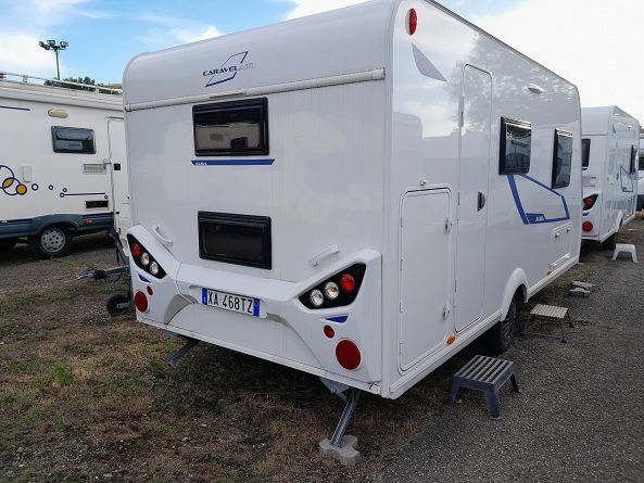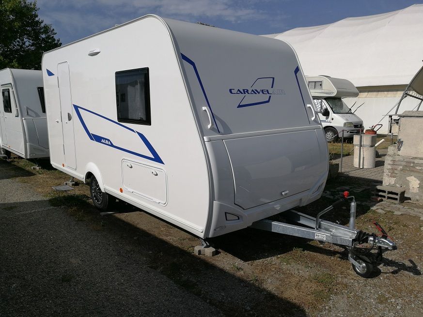 prezzo su strada caravan nuova immatricolata km zero in pronta consegna Caravelair 426 alba, tutte le pareti e tetto in vetroresina, posti letto 6, camera matrimoniale anteriore con letto fisso, dinette centrale con tavolo, letti a castello posteriori,wc thetford estraibile, serbatoio acqua lt.50, boiler trumatherme, doccianello e tenda doccia, stufa trumatic, frigorifero a compressore 12v 150 lt., zanzariere finestre, zanzariera porta ingresso, sportello gavone laterale, oblo' panoramico.